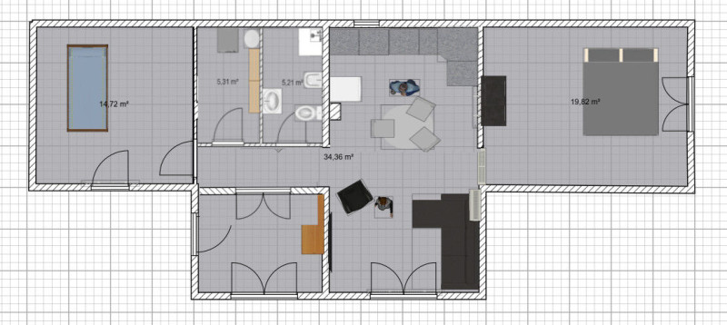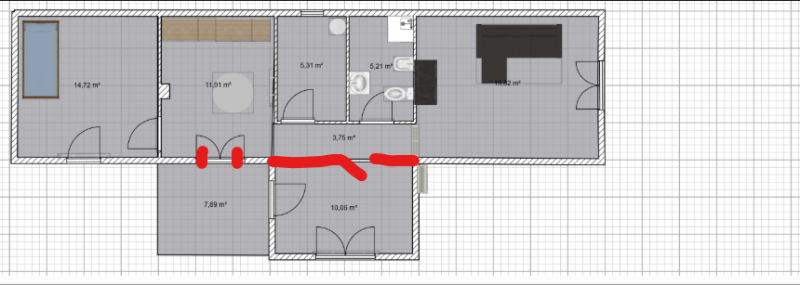 Nyilván nem méretpontos csak átdobáltam gyorsan a 2 helyiséget.De ha beépítitek a teraszt előszobának akkor is hagyd rajta az ajtót, mert egybenyitva brutál hideg fog bekúszni a bal oldali szobába.