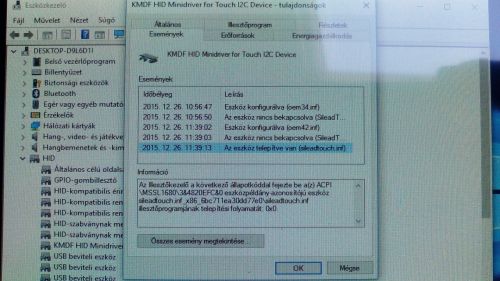 Azt hiszem, hogy az utóbbi napokban szinte minden kombinációt végigpróbáltam a drivert illetően, egy alkalommal érzékelte a kijelző az érintést, akkor is a felső felén a képernyőnek jól, az alsó felén meg 2-3 cm-rel feljebb (ezt a drivermentes win10 tiszta telepítésével sikerült elérni).A tiszta telepítéssel feltett Win10 (Lark_7i_Win_10_MSDN_TH2_32_HUN_Activated_Wimboot + 800.-as hsz driver pakk-ból az érintőkijelzőre vonatkozó driver) után ezt az üzenetet írja ki az eszközkezelőben (fájl átírás és driver telepítése után is - lásd a képen):