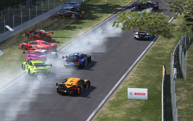 Ez csak kis koccanás volt, még simán fel tudok jönni nyomjuk tovább.3. Körben volt egy veszélyes rejoin előttem, pont az ideális ívre tért vissza, lassítottam, hogy elkerüljem az ütközést, mögöttem lévő az természetesen vakon volt, és telibe vert gáz elvétel nélkül, kerék kiszakadt szóval DNF. Egyszerűen nem néznek oldalra...