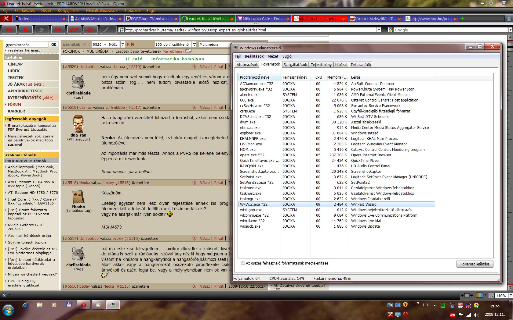 WinFast TV2000 XP Expert tunerem van, és win 7 ultimate 64es rendszerem. Felraktam a drivert(Windows 7 64bit build 7600.16385 WHQLed driver) és a pvr2-t (2.0.3.24) is. A gondom az lenne, hogy tv-zéskor nincs hang, de kép az van. Kívülről van összekötve az alaplapi hangkártyával, próbáltam belülről is, de úgysem volt jó. Egyébként win xp alatt tökéletesen működött. Ezen a linken: http://www.leadtek.com/eng/tv_tuner/overview.asp?lineid=6&pronameid=93&check=f ott van, hogy win7 kompatibilis. Most nemtom mit csináljak, vegyek egy másik típust vagy meglehet ezt valahogy oldani? Előre is köszönöm a segítséget. -