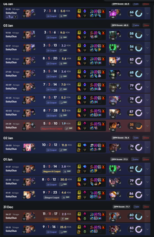 Buildekkel persze kísérletezek valamilyen szinten, de nem rajtam mennek el a meccsek. Szóval még ha engem "semlegesnek" is veszünk, bár score alapján első 2-ben mindig benne vagyok az 5-ből, de akkor is csapattársak tekintetében 50-50 kellene legyen. Viszont objektíven nézve, nálam ritkábban van mvp topos, jungler, adc, mid, supp mint az enemyben. Enemy jungler 10/8 alkalommal jobb.