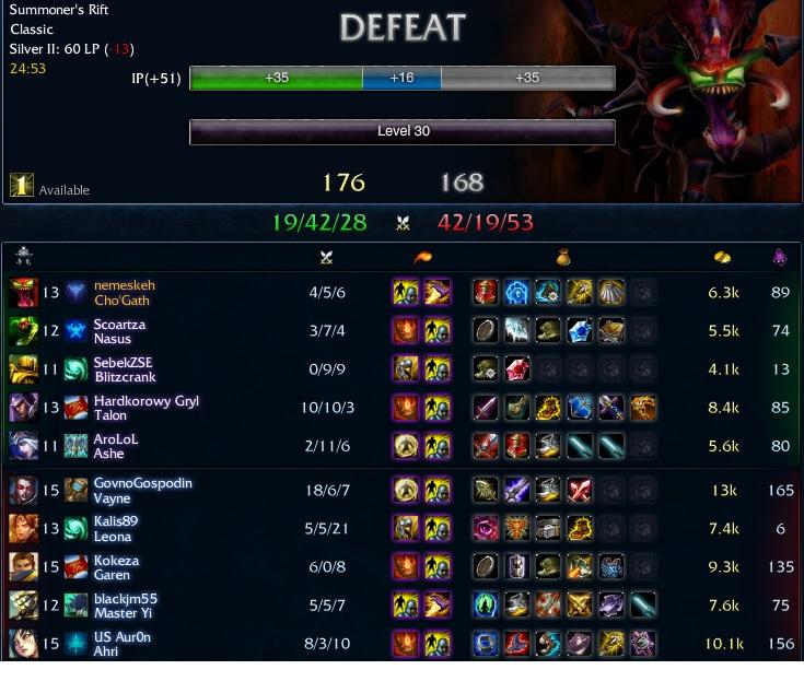 Aterzem a helyzeted, en is hasonlo cipoben jarok. 500. meccshez kozelitek az idei szezonban es bronz 3-ban vagyok jelenleg. Haromszor mentem fel bronz 2-be, mindharomszor ugy buktam vissza (egyszer egesz bronz 5ig (!!!!!!!)) hogy sorozatban vesztettem legalabb 8 meccset. Nem allitom hogy soha nem hibaztam, de ezeknek a lose streakeknek a jelentos hanyada olyan meccsekbol allt ahol vagy minimum 1 afk volt, vagy teljesen inkompetens/troll idiotakkal voltam osszerakva akik vegigflameltek a meccset es/vagy 0 perctol feedeltek. Aztan voltak az 1 win 1 lose streakek, az meg a total stagnalas, gyakorlatilag egy helyben allok ha ez van, lejatszok 10-20 meccset es nem mozdulok egy tapodtat sem. Mas meg lejatszik 10 meccset, abbol tegyuk fel 8at megnyer mert epp nem fut ossze trollokkal meg afkkal es Gold tier, gg. Nem rossz ez a rendszer, mert ahogy mondjatok aki uberfasza az ugyis feljut, de nem igazsagos.