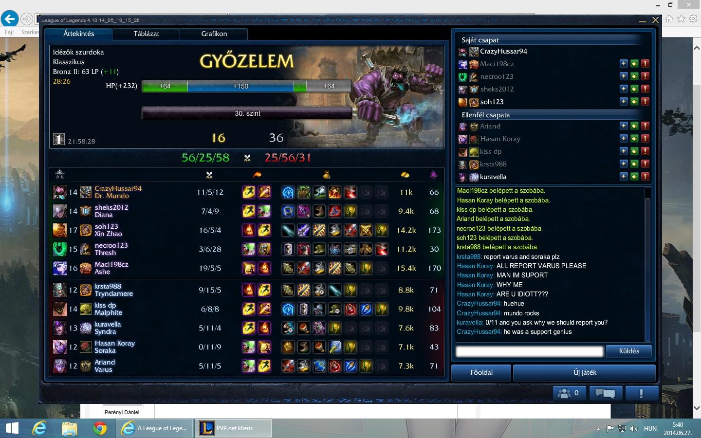 az tény, hogy junglezni nem tudok, de nem is megyek oda.. a többi lanen adc/top-ként sortartósban elvagyok, mid/supp jól megy, de amikor a gyerek 1 top/1mid/1jungle/1supp mellé beválaszt egy xin zhao-t majd 0-6 után mikor elküldöm az anyjába olyan válasszal jön, hogy "hát bocs én egyedül vagyok, hogyan tudnék jól teljesíteni?" na igen.. hihetetlen sok gyökér van és igen azért szopok én is bronze I-ben, mert a tard csapat miatt nem tudok feljebb kerülni.. ha látom, hogy szerencsétlen az adc inkább elviszem a kill-t morgana suppként, mert tudom, hogy legalább nekem lesz sebzésem és hozhatok valamit tf-ben, ha már az adc retardált -