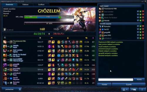 Szépen elkezdtük tolni a laneket, beütöttük a mid inhibet, de túl sokáig maradtunk, úgyhogy homeguard-dal megérkezett az ellen, mi pedig megnyalogattuk a kuki végét. Akkor ők szedtek mid inhibet, majd elkapták a Ziggs-ünket, és lebaronoztak ők is. Kidefeltük, megnyertünk egy tf-ot, megint leszedtük baront, majd amennyire tudtuk, bepusholtuk mindhárom lanet, és vártuk az utsó harcot. A végjátékban az ellen Jinx nem volt elég óvatos, úgyhogy egy siege minionra ráugrottam, utánaflasheltem, lassítás, ultival knockup, beflashelt a Shen is, letauntolta, soha nem jött ki a CC-ből. Emiatt kiace-eltük őket 5-0ra, és beütöttük a Nexust.