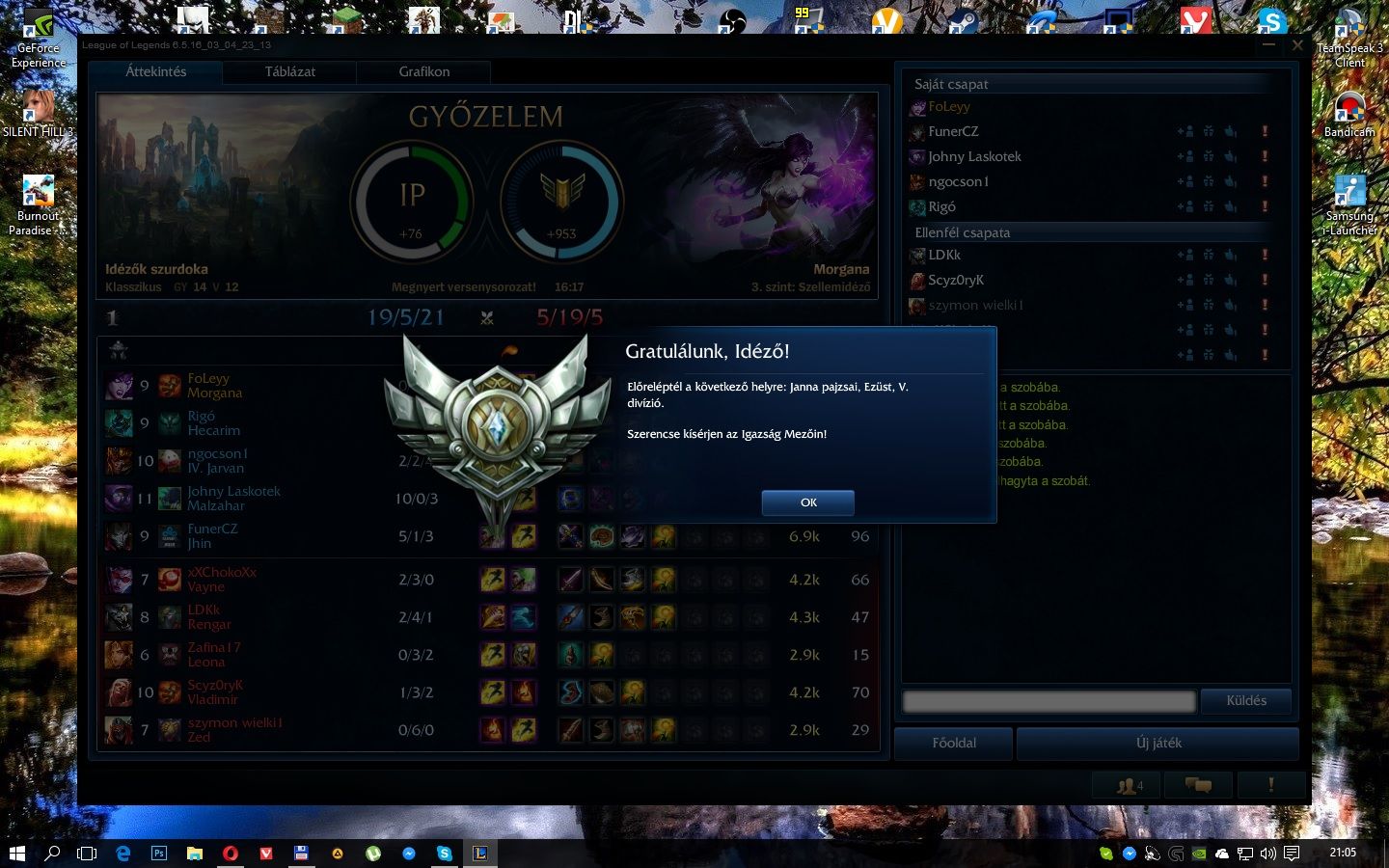 Akkor ha mmr alapján kapom meg akkor miért nem olyanokat kapok akik tudnak is értelmesen is játszani? Érdekes,hogy amikor elsőnek neki futottam 1150 mmr-mel akkor nem sikerült,tegnap újra neki próbálkoztam 0 LP-vel és 1150 mr-el,persze morgana support szerepben és egyből sikerült legalább silverbe feltornáznom magam és most vagyok 1300 mr-es. Bár most normálon kaptam olyan csapattársakat akik fogalmuk sem volt a játékról és a hősőkről. Jhin ultija szőrnyű volt nézni.