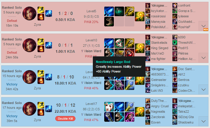 De egy voli, sion, j4-nél már gondolkodom, hogy kinek jobb a kill, nekem vagy éppen a lane champnek.De erre a tegnapi 3 meccsem meccsem a legjobb példa... diana és wu jungeleztem, hoztam a killt, gankelgettem, split push, 1-2 carryt mindig kiszedtem és elbuktuk... utána a sionnal oda is adtam a killeket, el is hoztam... El is lett bukva, bár ott az xXx LOL PrObOy PL LOL xXx vayne boton ment el a játék.... több halálja volt mint killje a csapatomnak... 30 percnél 1/21/5-be volt és természetesen a farmja megütötte az 25cs/10 percet...