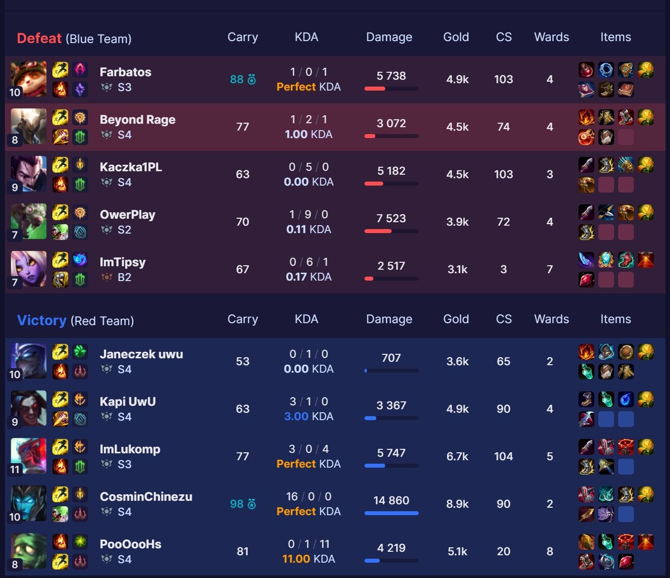 Bár szerintem csak nem trollkodtál eléggé, ha azt csináltad volna mint némely csapattársam azon az ominózus 5 meccsen, tuti a lose.Master Yi 15. perc int, onnantól 8db doran blade-el rohangált (pedig még talán nyerhető is lett volna ha nem trollkodja el lol), Malza mid 3-11-3, MF adc lane közepén mozdulatlanul (aktív afk) állva hal meg folyamat, finom... Ugyanezen az 5 meccsen az ellenfél minden, azaz minden játékosa pedig elképesztő összeszedett, nincs afk, nincs troll, mindenkinél kiváló kda, kiváló farm, kiváló mentál, szinte premade csapat szerű teamfight kombinációk.