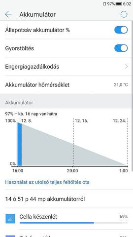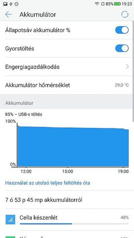 gyorstöltés is vagy 20W-al (táp oldal).A Custom ROM-okon csak 10-12W gyorstöltést mértem.
