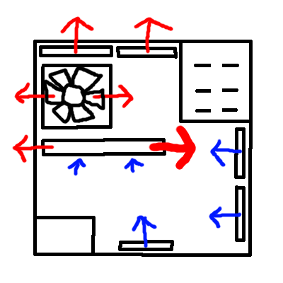 A procihűtőt utálom le és felrakni, ezért próbálom ennek a műveletnek a számát alacsonyan tartani, mert szerintem elég körülményes. Nyilakkal jelöltem a ventilátorokat, és pirossal kereteztem ahova rakok ventiket. Ott nem tudom, hogy fújjon vagy szívjon. Eszembe jutott, hogy pl. ha a vrm-re fújásra teszem, akkor lehet, hogy csak megreked a levegő, mert fölötte ott van a huzat a ház hátulja a és a procihűtő között.