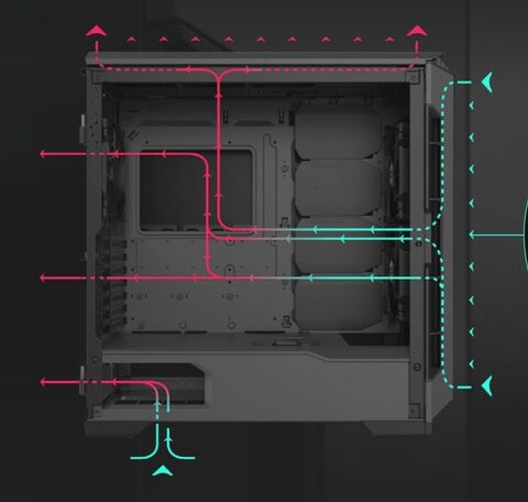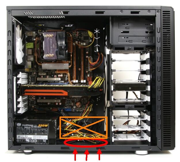 Ha a narancssárgával jelölt helyen túl sok a kábel, akkor nem fogja azokon jól átnyomni a friss levegőt az alsó venti és alig fog érni valamit. Ha viszont gyorskötözőkkel és szép kábelmenedzsmenttel elvezeted onnan a sok kábelt, akkor jól rá tudja vinni a kinti friss levegőt a VGA hűtőjére.
