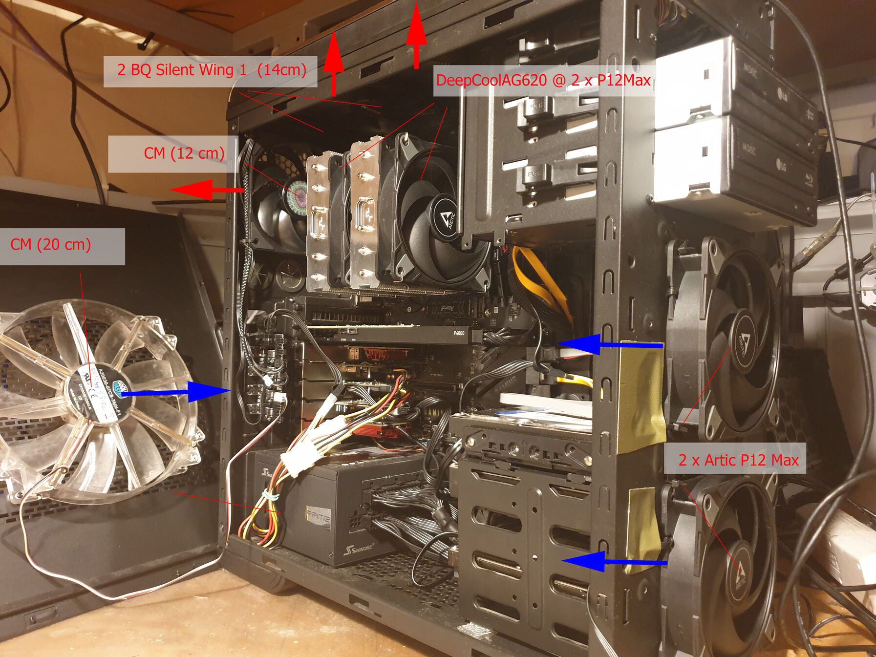Nekem a legjobb, mert a HDD tartó egyben kivehető, nem képez a merevítés részét, és betehető fordítva is. Én hosszában tettem, egy üres hellyel, illetve egyet a tetejére Ezek egy Gold (7200), egy Blue (5400) és egy régi Samsung (5200). Ami érdekes, hogy a Gold fölül 39-40 fokos volt, alul, ahol jobban telibe veri a venti tartósan 35 fok. A többi ez alatt. Így, hogy hosszéban állnak, és foghíjasan sokkal jobban átmegy a levegő rajta., Alul ipari 3M tépőzár (pontosabban "patent") tartja, olyan erős, hogy szint a gépet fölemeli, ugyanakkor rugalmasan rögízit a HDD blokkot, így ennek rezgései nem mennek át a házra (a ventik igen, régen azokat is gumibakon rögzítettem, de most nem szórakoztam, egyelőre becsavaroztam így kis finom vibráció érződik a házon azért.)Elől 2 db Artic P12Max, ugyanez van a DeppCool AG620-on is. Oldalt a frontról áttetem a CM 20cm-est, hátul is maradt a CM, a tetején meg 2 db 14cm Silent Wing2 szívja kifelé a meleget. Az aliexpressen vettem egy 4 potmeteres szabályzót, így mindent olyan fordulatra tekertem le, ahol még nem hallani semmit.