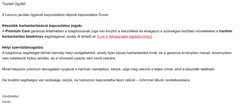 Segítséget szeretnék kérni. Adott egy Lenovo Legion 5, 9 hónap Premium Care garanciával. Múlt hét pénteken jeleztem a Lenovo oldalán, hogy a "D" billentyű nehezen, vagy egyáltalán nem működik, szeretném kérni a javítását. Azóta kaptam egy e-mailt kérdésekkel, amire válaszoltam (3 napja) és azóta sehol semmi.