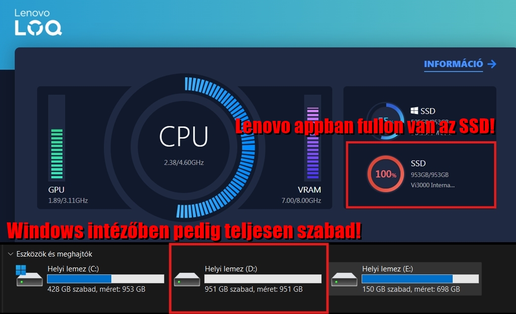 Sziasztok, Ez mitől lehet? SSD bővítésen vagyok túl, de Lenovo app azt mutatja, hogy fullon van az új SSD. Windows üresnek látja.