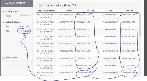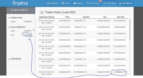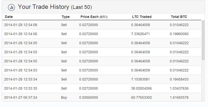 Eladtam ~60.77 LTC-t 0.0272-es árfolyamon BTC-ért. Elment mind, de nem stimmel a dolog. Hiányzik a sell oldalon még LTC, és az egyenlegem sem stimm. A nyitott orderek közt sem találok több sell-t. 1.647 BTC helyett van 1.474..