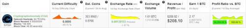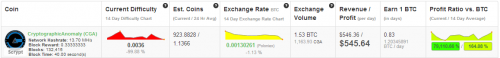Nagyon ingadozik a diff,én éjjel ezt bányásztam. 10 óra alatt 237 GRS, ez 12 órára 284,4, 24-re 568,8. Ez jelenlegi árfolyamnál (479) 0.002724552 BTC / nap,scrypt-ben számolva 0,5MH/s-el. Tehát 0.005449104 BTC/ day/ MH/s