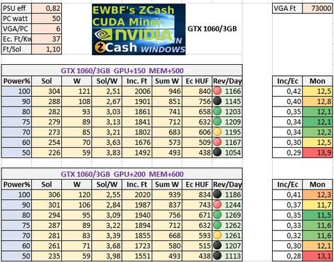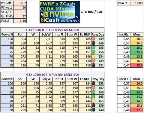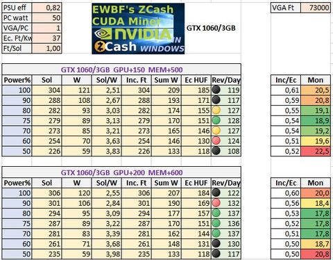 FONTOS: a fentiek csak magyar nappali áramdíjjal (37 Ft/KWh), az 1,1 körüli Ft/Sol napi kifizetési rátával és ZEC EWBF 0.3.4 cuda bányászattal érvényesek.