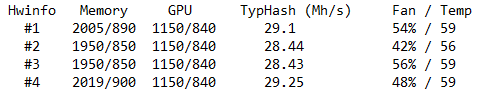 GTX 1070-es kartyakkal, 100%TDP, +150 CPU, +725MEM beallitassa es ~760w fogyasztassal csakanyoznak a kartyak korulbelul 700H/s-el darabonkent. Ez osszesen ~5600H/s. A program, XMR_stak, ezeket a hash ertekeket irja ki folyamatosan.