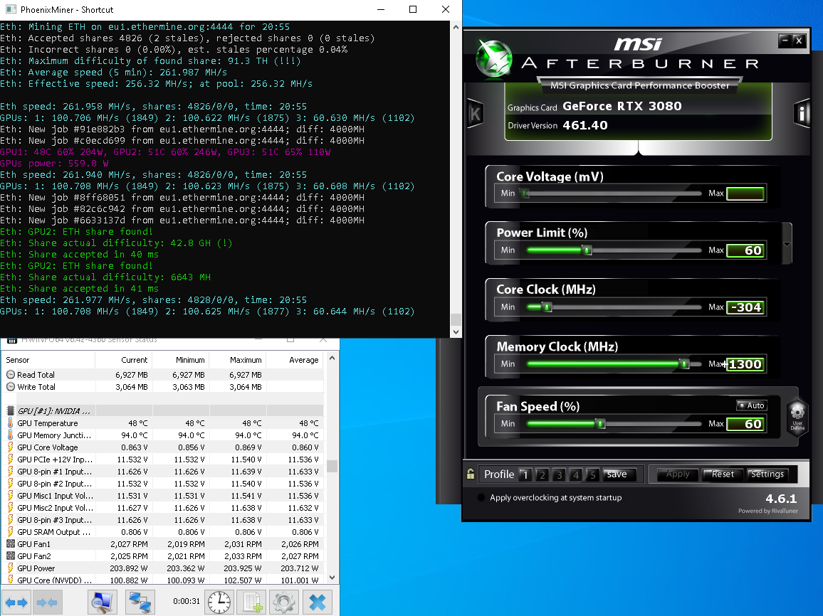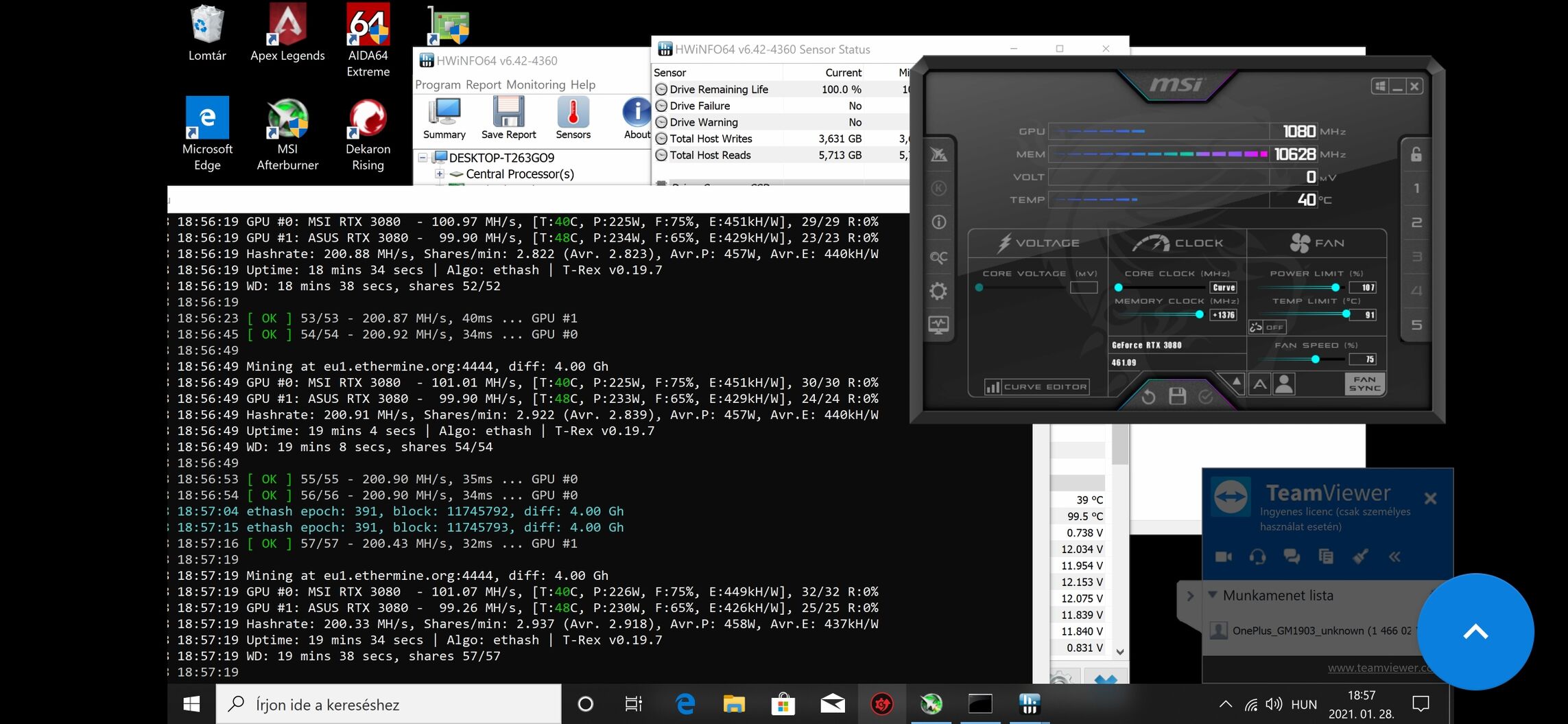 Én NH-n kezdtem, kipróbáltam hiveOS-t pár napra és visszatértem NH-ra. Nincsenek kihegyezve a kártyáim, így 1-2% a reject. Viszont a bevétel kárpótol érte, főleg amikor megugrik valamiért a többszörösere naponta többször és van hogy fél órát is. A gépek távol vannak tőlem, így teamviewer is jól jön. HiveOs-on is tudnak crashelni a kártyák, nem voltam előrébb stabilitásban. Persze idő kellett volna még kitapogatni, de az nekem nincs.