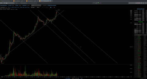 Hat latod a korabbi eseseket(negativ meredeksegu egyenesek) es az alap trend egyeneset(pozitiv meredeksegu). Ezek alapjan az idei csucshoz behuztam egy parhuzamos negativ meredeksegu egyenest(mert eddig mindig ilyen mertekben esett), ami megadja az alap trendvonal metszespontjaban, hogy mikor mennyire esik le. Vizszintes tengelyen latod az idot linearis skalan, fuggoleges tengelyen az erteket logaritmikus skalan.