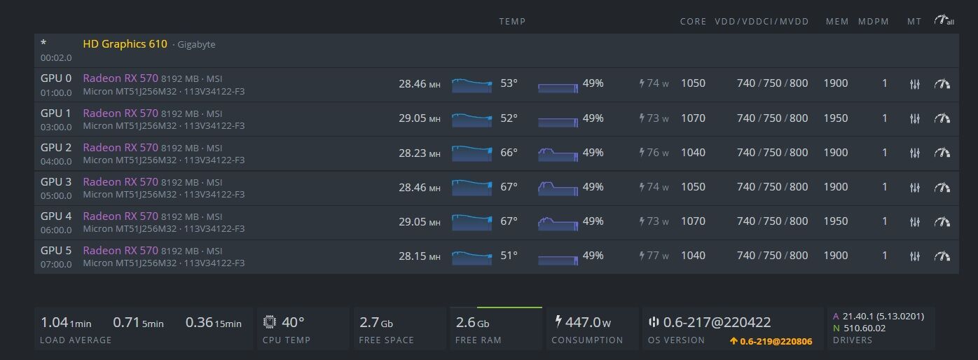 Ezt eddig nem láttam, én tapasztalati alapon szórakoztam ezekkel 4 rigben 48 kártyával, nekem a phoenix vált be, és mindenféle macera nélkül termeltek a rigek, nyilván addig szórakoztam vele, amíg stabil nem lett, ha leállt, az a túl alacosnyfesz miatt volt, nem a miner miatt. Ugyanott hagyva minden beállítást trm kevesebbet írt a hiveos, és a pool szerint is kevesebb hashrate volt.
