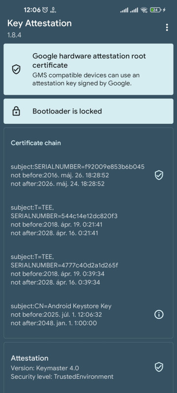 Elméletileg tudnék fizetni a Wallettel, de csak BASIC integrity van, Key Attestation azt írja, hogy "Bootloader is locked".