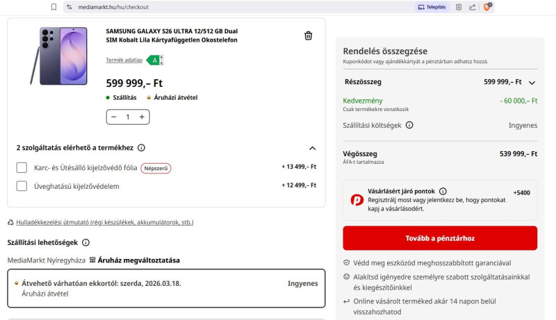 az új S26 Ultra, 12/512GB, 600.000 Ft körül szóródik a boltokban,