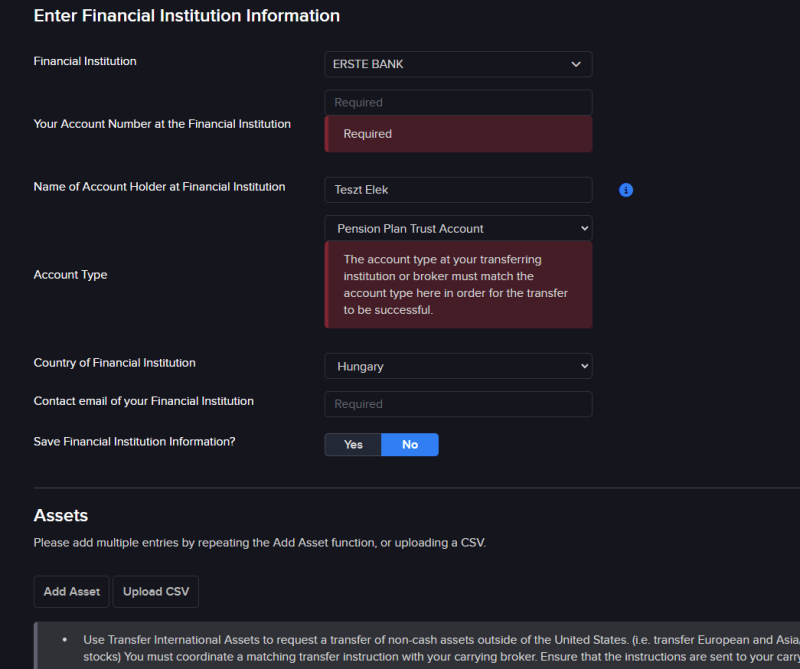 2) IBKR-en jól gondolom hogy pension plan trust account a tbsz típusa? 3) Az assetseket kézzel kell feltölteni vagy csv-vel is lelehet tölteni erstéről? 4) Norton féle számla műveleteknél szó van a T+x napra, ezt azt jelenti hogy 2 napot kell várnom a vásárlások/eladások után a transzfer előtt?