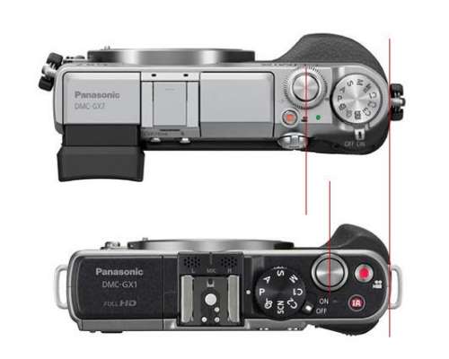 Itt jól látszik, hogy igazából nem vastagabb lett, hanem egyszerűen ugyanaz a markolat beljebb lóg a vázon. És itt most az is jól látszik, hogy ehhez bizony az expo gomb is igazodik, az is beljebb került a vázon. Végeredményben ez azt eredményezi, hogy a GX1/3-hoz nagyon hasonló fogást fogunk kapni, csak váz beljebb lóg majd tenyerünkhöz és ott ad majd egy kellemes alátámasztást. Azaz igazából még jobb, még stabilabb lesz a gép fogása, mint eddig volt.