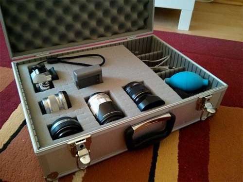 A) Egyik oldalt PEN + nem túl hosszú objektív (pl. 9-18, 45), oldalával lefelé; másik oldalt 3 obi, jellemzően a Pana 20-as kis tatyójában kettő objektívsapkával egymás felé fordítva, mellette vagy fölötte egy harmadik, akár hosszabb is (12-50 vagy 40-150).