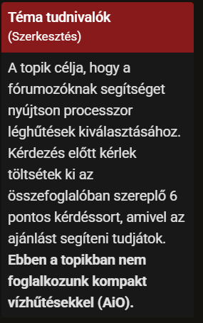 A topik célja, hogy a fórumozóknak segítséget nyújtson processzor léghűtések kiválasztásához. Kérdezés előtt kérlek töltsétek ki az összefoglalóban szereplő 6 pontos kérdéssort, amivel az ajánlást segíteni tudjátok. Ebben a topikban nem foglalkozunk kompakt vízhűtésekkel (AiO).