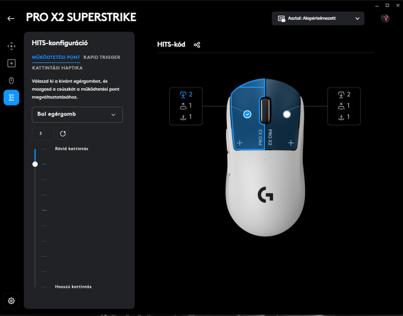 Három dolog állítható, a klikk actuation pointja, a haptikus visszajelzés erőssége, és a rapid trigger illetve annak érzékenysége.
