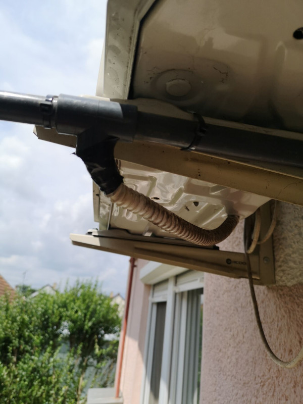 Split klíma kondenzvíz kifolyó csőre rá szigetelő szalagozta a szerelő a fehér csövet.