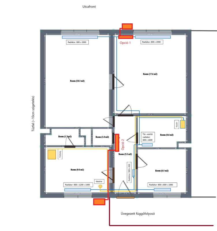 Opció 2: közlekedő, a WC ajtó felett. Pro: innen nagy valószínűséggel mindenhová jutna a hidegből. Con: nagyon kicsi a légtér, szóval valószínűleg túl kellen hűteni a folyosót; sokkal körülményesebb kivitelezni (két főfal áttörés, mert a bejárati ajtó mellett/felett nem fér el a csövezés, nehézkesebb a lejtés kialakítása a kondenzvíznek).