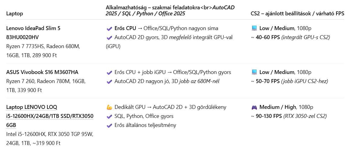 Két laptopot linkelek Ryzen 7 procival és erős integrált grafikával. Vagy ha a CS2-re és 3D alkalmazásokra akarsz rágyúrni, akkor egy LOQ gamer laptop javasolt, dedikált videóval és gamer sallangoktól mentes visszafogott kinézettel. És egy AI generált áttekintő táblázat a három laptop [értékeléseivel]. A Windows bolti (40-50 ezer Ft-os) telepítéseket nem linkeltem be. Ha Python-t szeretnél programozni, akkor nem kellene, hogy problémát okozzon a saját telepítés.