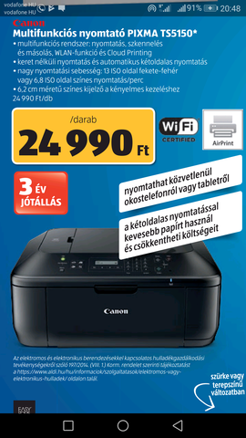 Köszönöm, végül a Canon TS5050 mellett döntöttem. Talán az öt tintapatron miatt, ami külön külön is cserélhető és nagyobb kapacitással is bír. Emellett ez nem tud faxolni, nincs is vezetékes telefonom, és ha eljön az ideje, akkor utángyártott patronnal is lehet majd etetni a fax hiánya miatt.