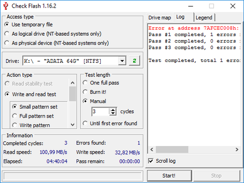 Ez alapján ismét vezérlőhiba lesz, azóta több tesztet futtattam legtöbbje jó lett, viszont olykor hibára fut, persze a teljes teszt (full pattern) zárná csak ki a memóriachip hibáját, de esélyes, hogy ennél is a vezérlővel van gond, mert sosem jelzi, hogy baj van, hibásan átmásolja a gépre a fájlokat.