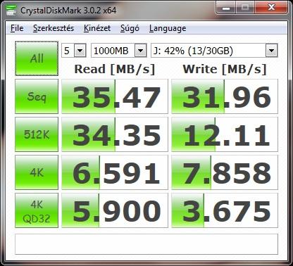 Elméletben(vagy inkább garantáltan annyi), csomagolására is rá van írva, meg előtte én is azt találtam amikor nézegettem a neten (itt az olvasás lassabb, viszont az írás annyi és inkább az legyen jobb gyakorlatban). Meglepődtem én is, de többször mértem és mindig annyi volt az olvasás, az írás pedig 42-46 között váltakozott. Így van örülök is, azért nem vettem elsőre sandisk cruzer extreme-t, mert nem lehetett tudni, hogy a régebbi lapban megy-e az USB 3-as kártya, de mint látható simán megy.