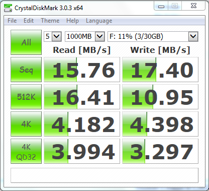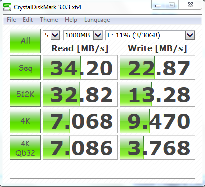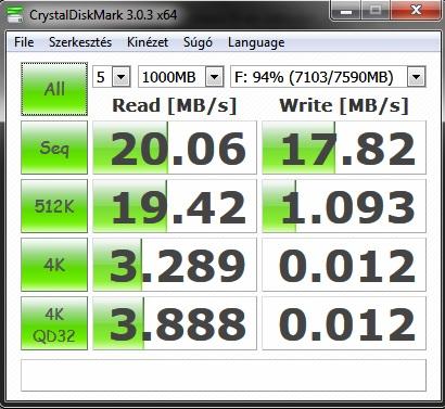 Csináltam egy tesztet, igaz teli volt a kártya (Nem volt teli mert tudtam róla törölni, csak nem dolgozta fel a tesztprogram. 43% foglalás volt rajta.), mert telepítő van rajta és bootolhatóra van formázva. Ha a kevés adat és más fájlrendszer javíthat a sebességén akkor megcsinálom majd még egyszer a tesztet. 1m USB hosszabbító is be van iktatva a rendszerbe.