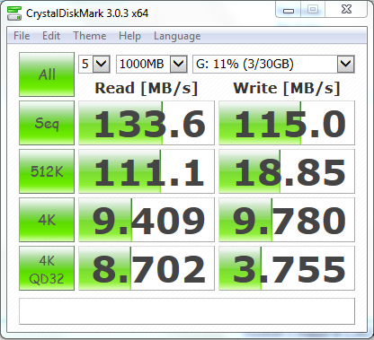 Írás a pendrive-ra: 500MB/s-ról indul (szintén a gyorsítótárazás miatt), 20-30%-nál beáll 160MB/s környékére, majd 50-60%-nál 110MB/s-ra, majd a legvégén 2-3 másodpercet gondolkodik mielőtt befejezné a folyamatot.