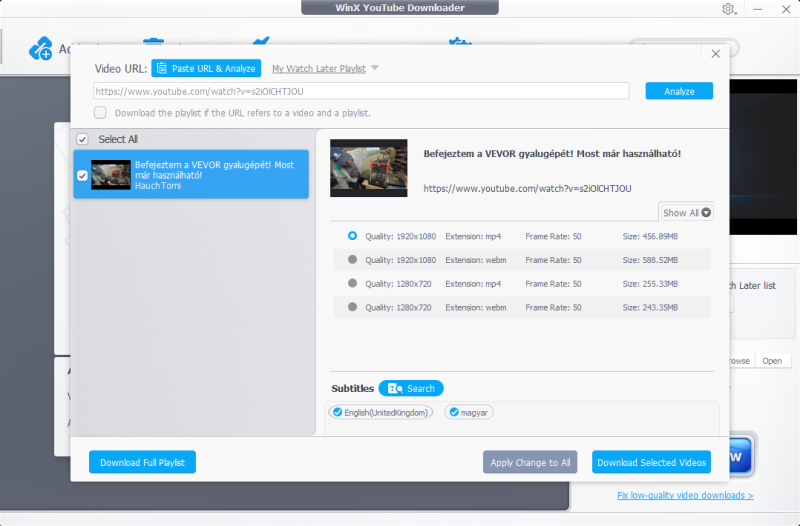 Válaszd a windows-os letöltést, tud magyarul, nincs parancssor. Ha a videónak van automatikusan generált fordítása, a Parabolic képes ezeket is lehúzni a választott nyelven.