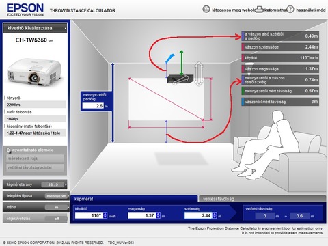 Egy 2 m széles képet ezek a vetítők 2,46 és 2,95 m távolságból vetítenek, és amennyiben ennek a képnek az alja 0,7 m-re van a padlótól, akkor a teteje 0,78 m-re van mennyezettől, és a megfordított projektort úgy kell felszerelni, hogy az 0,84 m távolságban legyen a mennyezettől. Mindezek 2,6 m belmagasság esetén érvényesek, és én is az Epson kalkulátorából olvasom ki. Nem olyan ördöngösség annak használata.