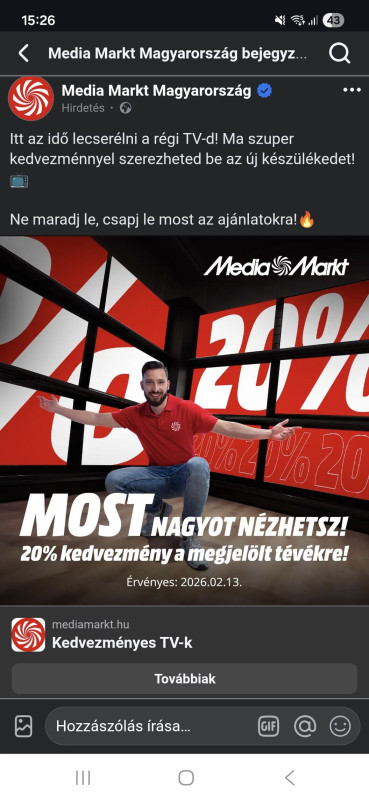 "Az ajánlat 2026.02.13-án, legfeljebb a készlet erejéig valamennyi MediaMarkt áruházban és a weboldalunkon leadott megrendelés esetén érvényes. Áraink az áfát tartalmazzák. Csak háztartásban használatos mennyiségeket szolgálunk ki. Megjelenítési hibáért felelősséget nem vállalunk. Egyes termékeinket szimbolikus fotóval ábrázoltuk."