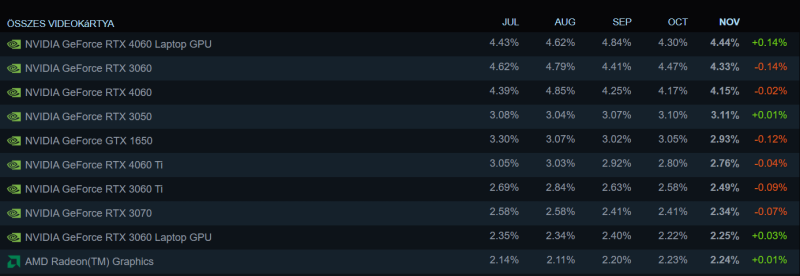 Az első tízben csak Nvidia kártyák vannak és jellemzően az 1080p-re készített típusok, szerintem nem véletlenül, mert ezek olcsók és jó teljesítményt nyújtanak. Három dolog lepett meg, az 1650, a két laptop GPU és a 3050. Utóbbi mondjuk tetszetős, főleg a 6 gigás verzió, mert nem kell neki külön tápcsati.
