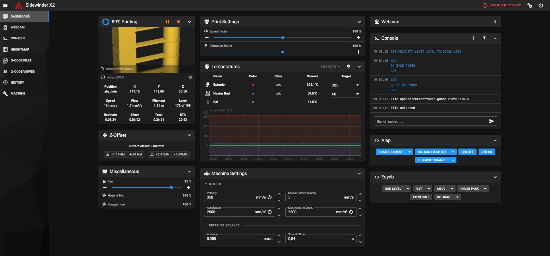 Az alap sebesség most 100mm/s, a retract pedig 0.75mm 40mm/s.Érdemes kipróbálni a klippert, mert tényleg hoz minőségbeli javulást megfelelő beállítással. (pressure advance, kinematikai rezgés kompenzáció, nagyobb sebesség, nagyon gép beállítás, stb.)