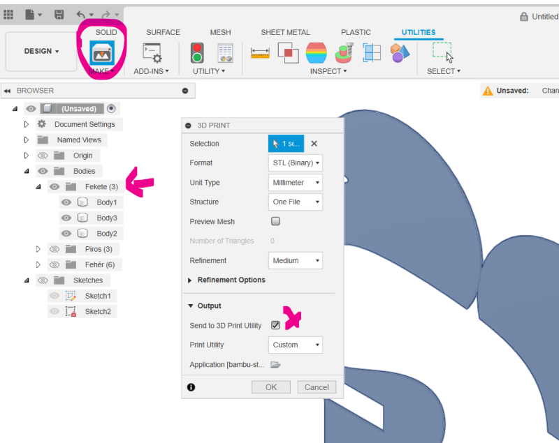 Addig jó, hogy a Fusionban kihúztad. Viszont amikor egy színnel megvagy akkor csinálj egy "Group"-ot és húzd bele az azonos színeket.Mindig new body legyen és ne join, mert azt akarja alapból. Ha így előkészítetted akkor már csak grupponként ki kell exportálnod stl-be.