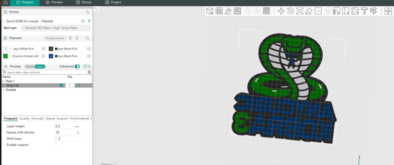 Ebből a nézetből ez egy lightbox kupakjának belső fele. A fusion-ben kiemeltem a környezetből a különböző színű elemeket extrudálással. Ez a lightbox belseje és ott nem zavar az eltérés. A külsejét (a lap másik felét) viszont szeretném síkban megtartani hogy az nyomtató ágyra tapadjon rá. Van lehetőség arra, hogy ezeket a színeket átörökítse valahogy az alattalevő rétegeknek és a lapka másik része is ugyanilyen színű legyen?