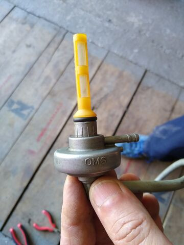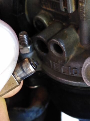 Aztán apósjelöltnek volt egy ötlete, hogy öntsünk benzint a blokkba, és utána indítsunk. Nem tudom ez mennyire etikus, szakszerű, de második próbálkozásra elindult, mentem is vele 2 km-t kb gyorsan, és elég jól hasított. Aztán alapjáratot is sikerült beállítani, mert azt ott jól eltekergettük. És mivel meleg volt a motor, utána többször is indult, haza is vittem, ca 25 km. Útközben csak annyi probléma volt, mint a vétel után, hogy fullgázon kicsit elkezdett visszafulladni. Nagyjából ennyi.Aztán van még két kérdésem. A karbiból kihúztunk egy csövet. (Azt a rózsaszínt.) A csőben volt egy rugó, a rugó végén meg egy...csapágygolyó.