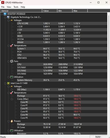 A vrm-et most nem néztem, de egy korábbi mérés peakje 65 fokra írta, ami kizárt, mert forróság ömlik onnan. A cpu-ra a CPUIDHWMONITOR progi ellenben 100C peaket ad ki teljes torture terhelésen (miközben langyos szellőt fúj ki a cpu hűtő).