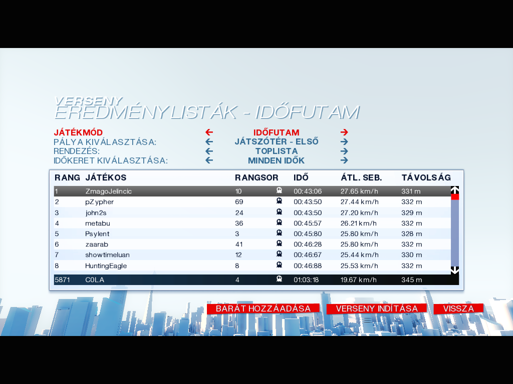 Azért kellett új profilt csinálnom, mert amikor megdöntöttem a Szélen pályán a 44 mp-s időmet, akkor nem rögzítettem, és nem bírtam magamat túl teljesíteni, így kénytelen voltam új profilt létrehozni hogy feltudjam venni újra.