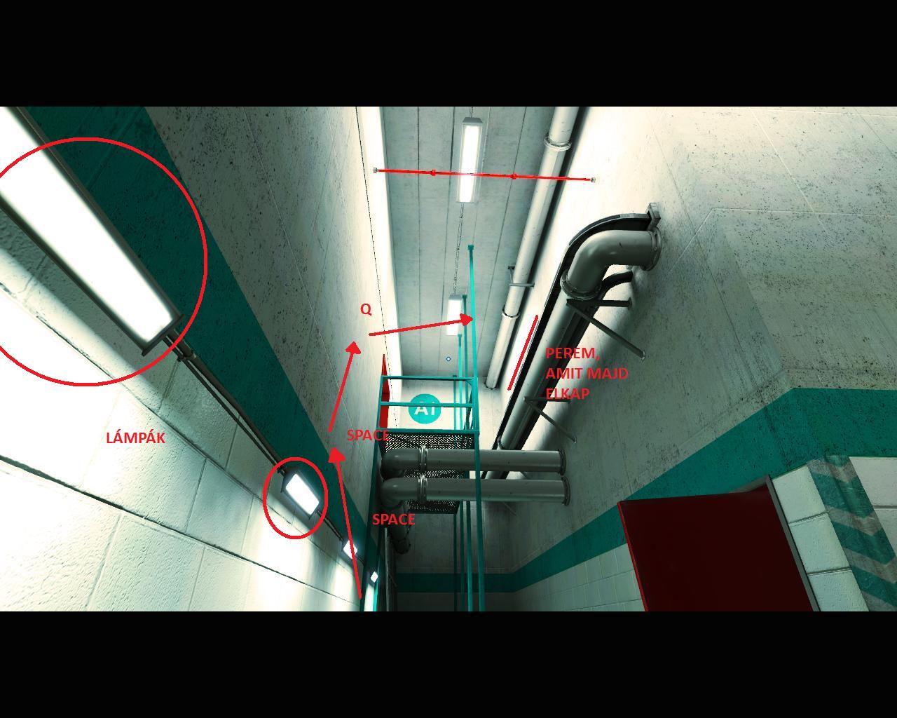 ott először két spacet kell nyomni, aztán Qt. Így 180fokot megfordul és onnan falon futásból nyomok space+Q+spcaet. De amikor felértem, annál a kék színű 'paravánnál" is lehetne space Q spcae, csak van hogy túl fut rajta és leesek...